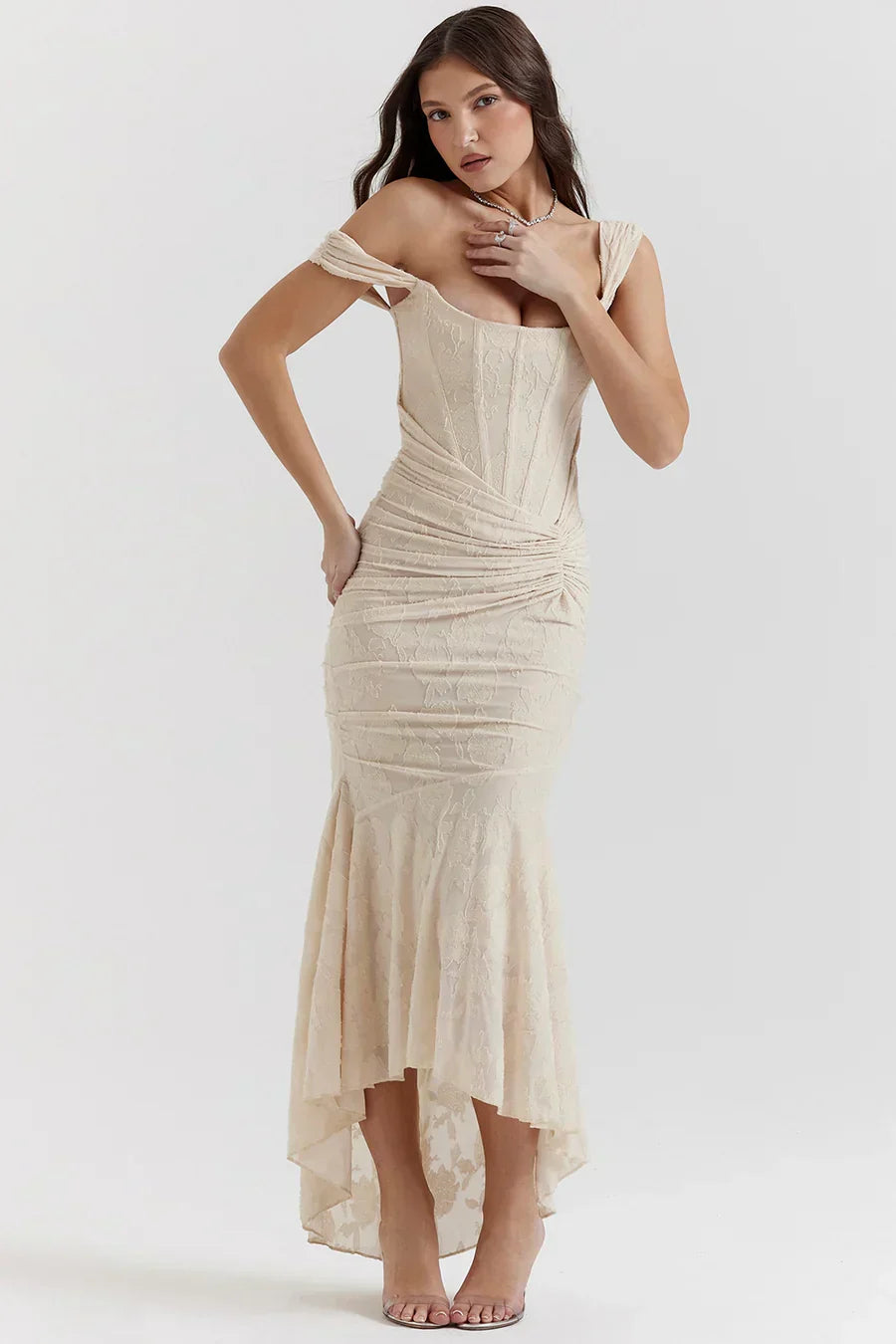 Gorset pięknie dopasowuje się do sylwetki, podkreślając figurę, a drapowane detale wokół talii tworzą kobiecą sylwetkę. Ramiączka odsłaniające ramiona dodają romantycznego i zmysłowego akcentu, a dół w kształcie rybiego ogona z lekkim wykończeniem typu high-low porusza się z wdziękiem.